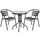 Whether you need to add more seating space or create an intimate conversation area, this versatile round tempered glass top table with 2 chairs is up to the task. Enhance the look of your bistro, cafe, restaurant, hotel or home patio space without taking up too much real estate. The ripple designed table top features a smooth surface for keeping items level. The lightweight chair features a curved slat style back to keep you comfortable. For easy storing and cleaning purposes these chairs stack up to 2 chairs high. A black powder coat finish lends this set a bold, versatile appearance. Cross braces provide extra stability when sitting and these sturdy chairs hold up to 352 lb. weight capacity. Designed for all-weather use, this set is a great option for indoor and outdoor settings. For longevity, care should be taken to protect from long periods of wet weather. Whether you are just starting your business or upgrading your furniture this seating group is a wise investment.