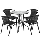 If you love hosting family and friends on your deck or need extra seating for the new dining patio of your cafe, this square table and 4 chair set is just what you need. The table's rippled designer glass top has a smooth surface for keeping items level. The rattan edge band complements the chairs and adds just the right touch for a stylish cohesive look. The lightweight chairs feature a curved back, comfortable rattan seat and integrated arms. Cross braces provide extra stability when sitting and these sturdy chairs hold up to 352 lb. weight capacity. For easy storing and cleaning purposes these chairs stack up to 23 high. This set was designed for all-weather use making it a great option for indoor and outdoor settings. For longevity, care should be taken to protect from long periods of wet weather. Whether you are just starting your business, expanding your "al fresco" seating or springing for the outdoor kitchen you've always wanted, this set will give you the perfect look.