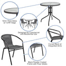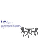 If you love hosting family and friends on your deck or need extra seating for the new dining patio of your cafe, this round table and 2 chair set is just what you need. The table's rippled designer glass top has a smooth surface for keeping items level. The rattan edge band complements the chairs and adds just the right touch for a stylish cohesive look. The lightweight chairs feature a curved back, comfortable rattan seat and integrated arms. Cross braces provide extra stability when sitting and these sturdy chairs hold up to 352 lb. weight capacity. For easy storing and cleaning purposes these chairs stack up to 23 high. This set was designed for all-weather use making it a great option for indoor and outdoor settings. For longevity, care should be taken to protect from long periods of wet weather. Whether you are just starting your business, expanding your "al fresco" seating or springing for the outdoor kitchen you've always wanted, this set will give you the perfect look.