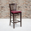 Create a first-rate dining experience by offering your patrons great food, service and attractive furnishings. This classic walnut wood bar stool will offer guests a warm, inviting look when entering your establishment. This chair will make an attractive addition to your restaurant, pool hall, lounge, bar or other high traffic venue. This stool is easy to clean, which is an important aspect when it comes to a business. This bar stool was designed to withstand the daily rigors in the hospitality industry, but will also provide a cozy, intimate quality to your home. The vertical slat back design and thickly padded, burgundy vinyl upholstered seat will keep your guests comfortable. The durable frame is stabilized with mortise and tenon construction with metal wood screw reinforcements. Two curved support bars provide extra stability and include a footrest for improved posture. The floor glides help protect your floors and ensure smooth gliding. This charmingly styled chair is a must have, whether used in the home or your commercial business.
