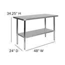 Give yourself some extra space for catering parties or setting up the buffet line at your eatery or bistro and increase functionality in your busy restaurant kitchen with this commercial kitchen prep and work table with adjustable undershelf. This steel commercial work table is a great space for bulk food preparation for businesses such as daycares, hotels and restaurants. This versatile steel table can be placed against a wall or used as a freestanding kitchen island. Strength and durability are important factors when choosing equipment. Made from quality stainless steel, this metal utility table resists corrosion and holds up to 600 lbs. weight capacity while the undershelf holds up to 200 lbs. This commercial grade work table is certified to NSF quality standards reducing the chance of foodborne illness. Not only for kitchen use, this stainless prep table can be used in an outdoor kitchen away from the elements on a covered patio or deck, as a planting station in your greenhouse or a work surface in your garage. Rounded corners prevent scrapes and cuts and this multi-use work table easily assembles in under 10 minutes with the included tools. Adjustable feet move up to 1" to keep you level on uneven flooring. Remove any traces of food contaminants with water and a neutral detergent followed by a dry cloth to keep this shiny piece looking new.
